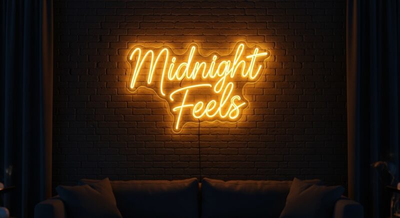 The “Midnight Feels” custom LED neon sign in stunning yellow — a bold statement piece for any space. Hand-crafted LED neon flex mounted on premium clear acrylic backing.
