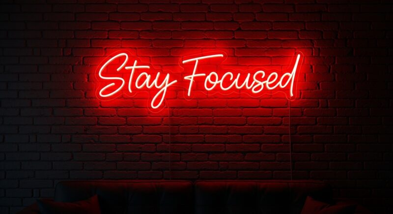 The “Stay Focused” custom LED neon sign in stunning red — a bold statement piece for any space. Hand-crafted LED neon flex mounted on premium clear acrylic backing.